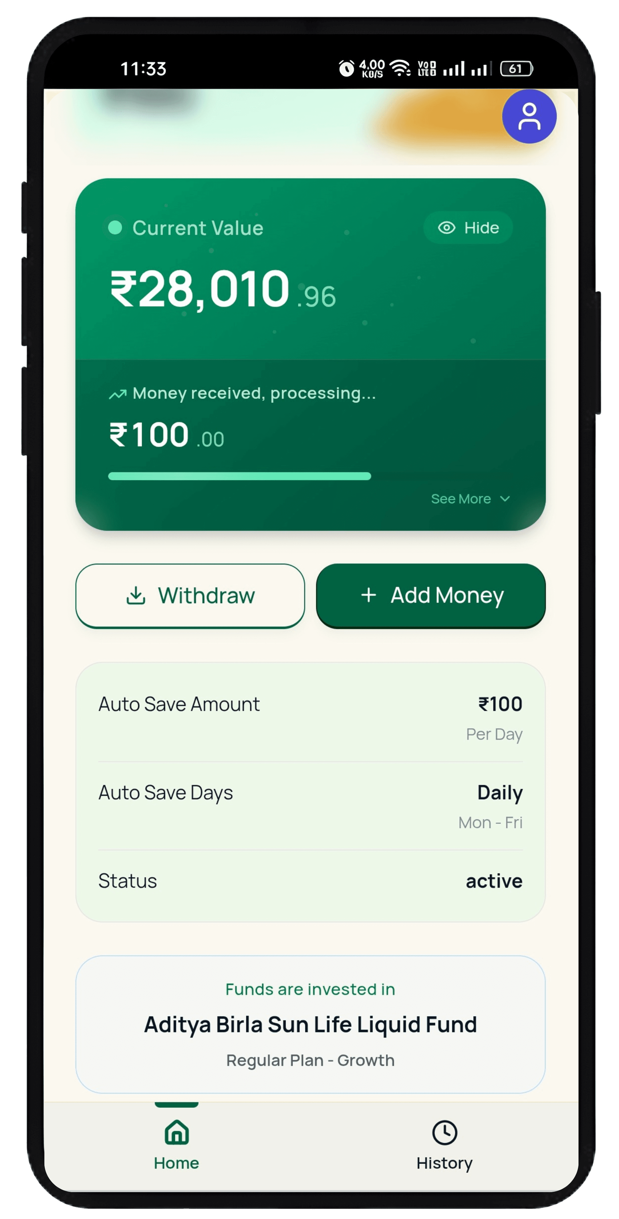 Your savings are invested in Aditya Birla Sun Life Liquid Fund, one of the most trusted and low-risk mutual funds in India.